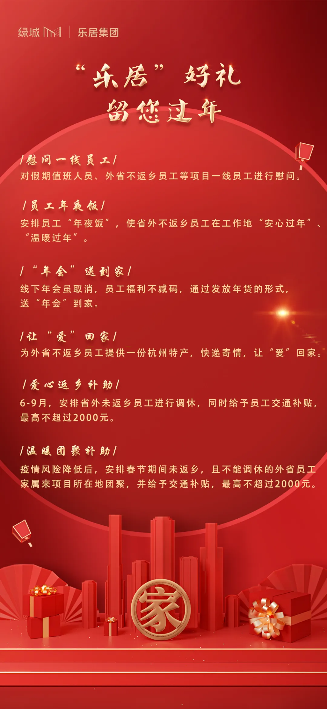 然而近來(lái)國(guó)內(nèi)疫情形勢(shì)依然嚴(yán)峻,為了響應(yīng)政府打好冬春季疫情防控攻堅(jiān)戰(zhàn)、積極引導(dǎo)外省人員盡量留浙過(guò)年的工作部署,綠城樂(lè)居集團(tuán)第一時(shí)間發(fā)出通知,開(kāi)展各種暖心舉措,號(hào)召員工留杭過(guò)年。